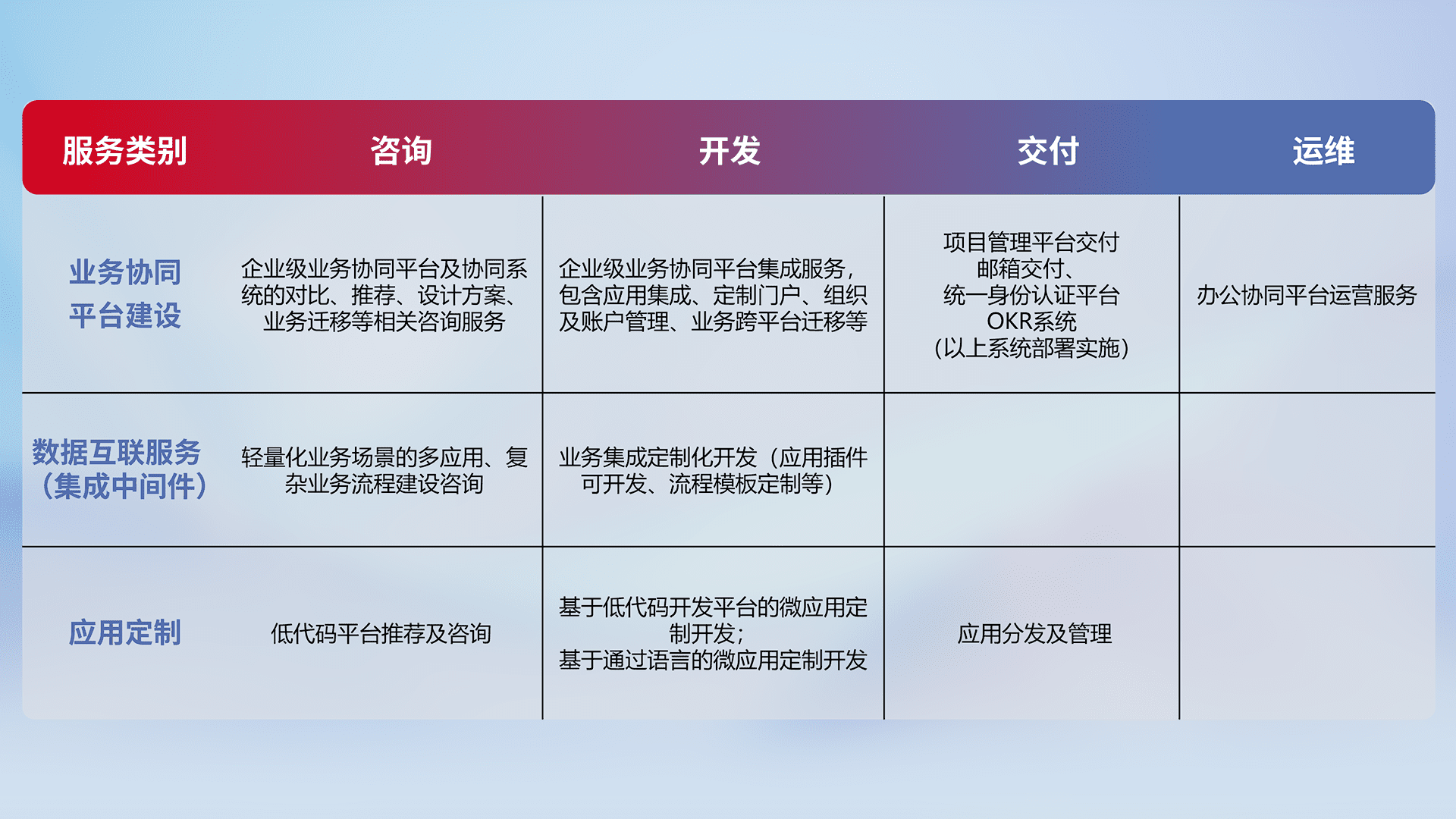 针对钉钉、、、、企微、、、IDaas等平台级产品提供产品的规划、、、方案、、交付、、、定制化开发等服务,,,,实现如统一协同办公、、、、智能客户服务、、混合会议管理、、、、智能数据查询、、等业务场景,,,,实现数字化转型。。。