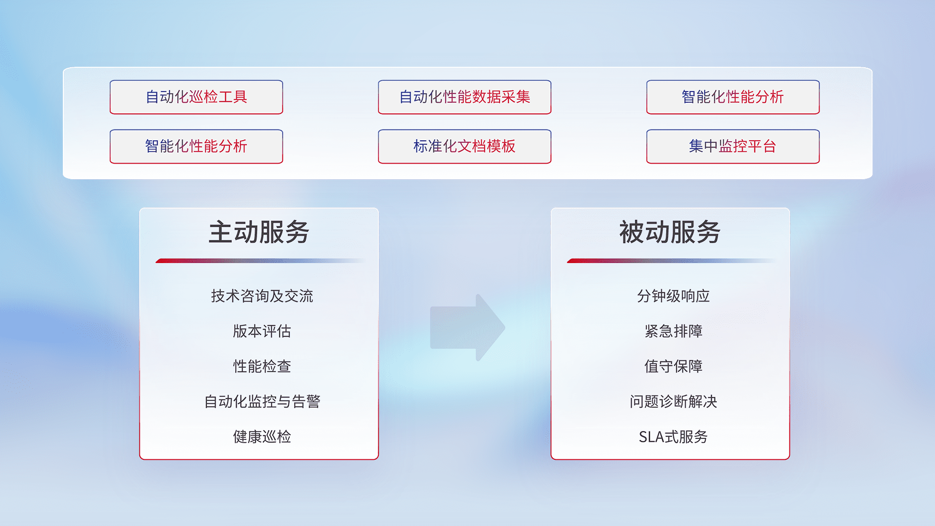 智能化工具和标准化文档,,保障服务质量,,,提供主动服务(包含技术咨询、、版本评估、、性能检查、、自动化监控与告警、、、健康巡检)和被动服务包含(分钟级响应、、、、紧急排障、、、值守保障、、问题诊断解决、、、、SLA服务)。。。